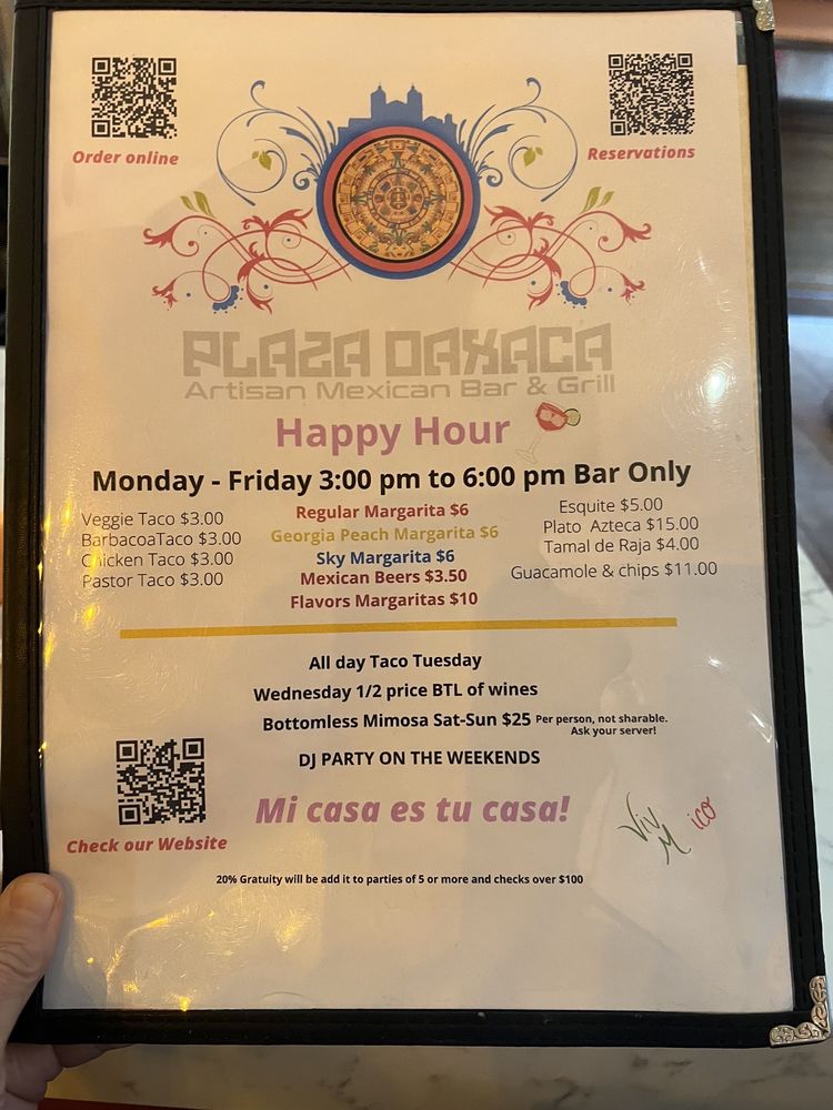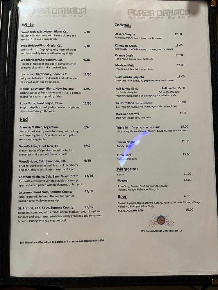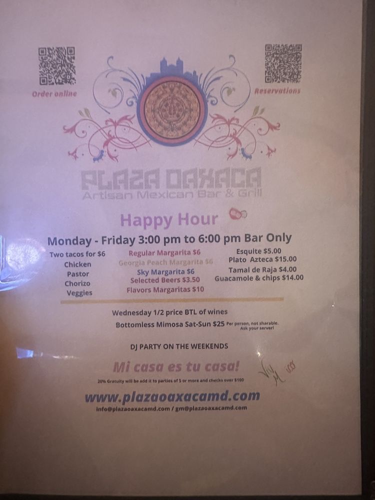 Plaza Oaxaca, a Mexican bar located in Rockville, MD, offers a variety of dishes perfect for groups or a casual night out. With options for delivery, takeout, and outdoor seating, this spot is great for any occasion. The menu features appetizers like Guacamole Dip and Queso Fundido, delicious entrees such as Fajitas and a mix and match taco option. For dessert, indulge in Churros or Tres Leches. Customers have praised the friendly service and welcoming atmosphere, making it a go-to spot for many. Plaza Oaxaca also offers happy hour specials and a full bar for those looking to unwind with friends. Don't miss out on this gem for authentic Mexican flavors in a cozy setting.